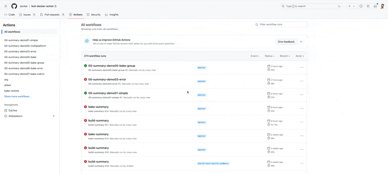 We now provide Docker Build Summary, a GitHub Actions Summary that displays reports and aggregates build information. The Docker Build Summary offers additional details about your builds in GitHub Actions, including a high-level summary of performance metrics, such as build duration, and cache utilization (Figure 1). Users of docker/build-push-action and docker/bake-action will automatically receive Docker Build Summaries.