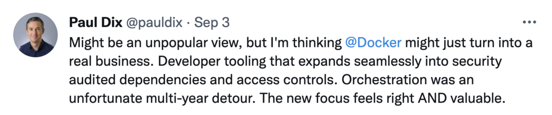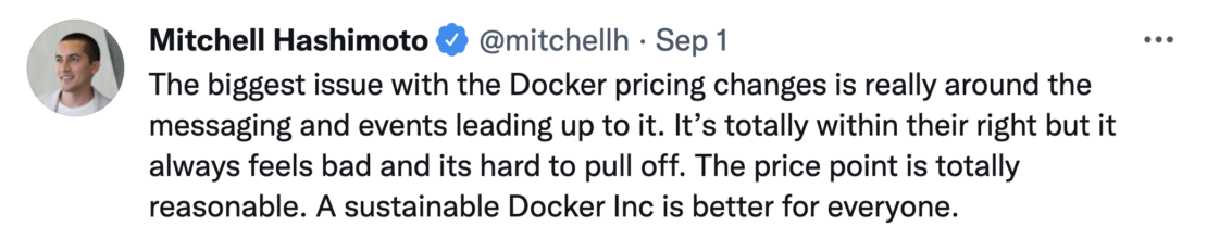 Our focus on this mission – investing in developers and reducing complexity – was the driver of the Docker subscription updates we announced on Aug 31, 2021. The overwhelming, positive support from our community, both individual developers and businesses, who recognize the value Docker provides has been humbling and encouraging. These community members see the updated terms for what they are – a means for us to sustainably scale our business and continue delivering delightful Docker experiences to all developers. To share just a few examples: