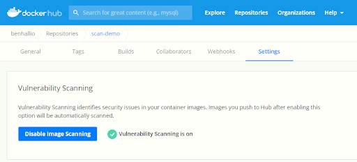 You can enable a repository’s vulnerability scanning in its respective Settings tab.