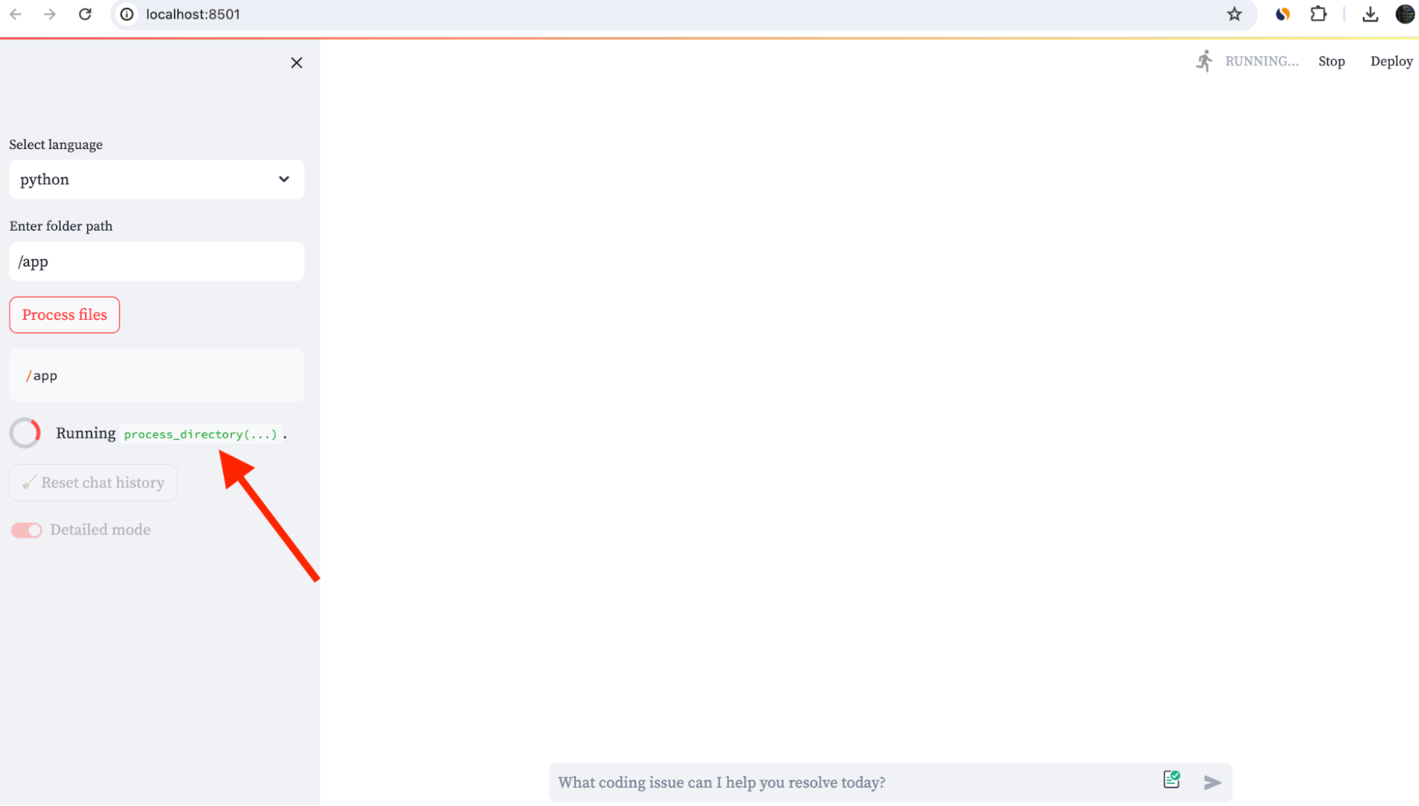 In the sidebar, enter the path to your code folder and select Process files (Figure 6). Then, you can start asking questions about your code in the main chat.