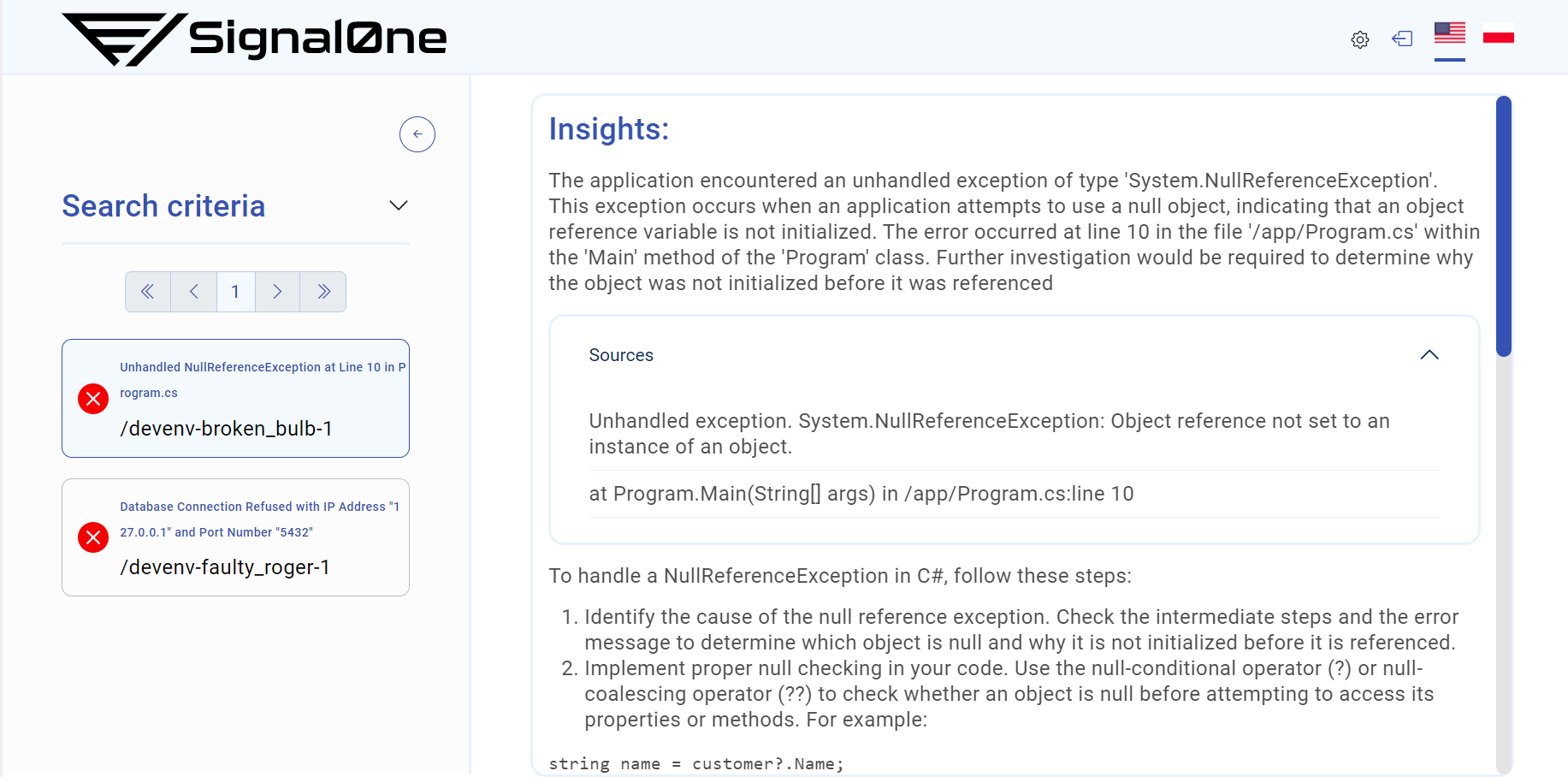 Signal0neai/broken_bulb:dev. It’s a C# application that throws System.NullReferenceException during the startup. Thanks to that application, you can observe how Signal0ne discovers the failed container, extracts the error logs, and analyzes it. - faulty_roger: This service uses the image