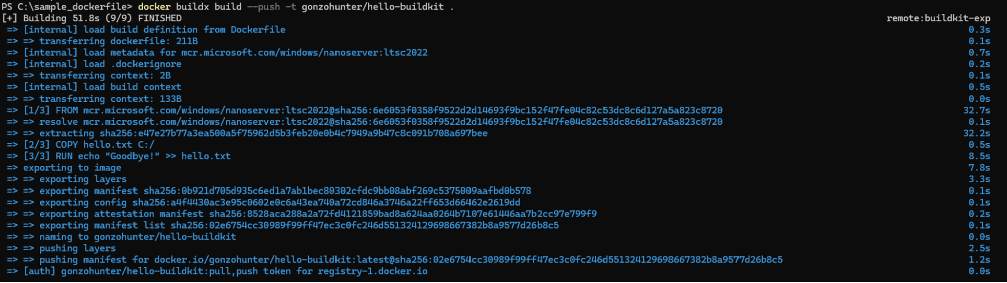docker buildx build --builder buildkit-exp --push -t <your_username>/hello-buildkit .