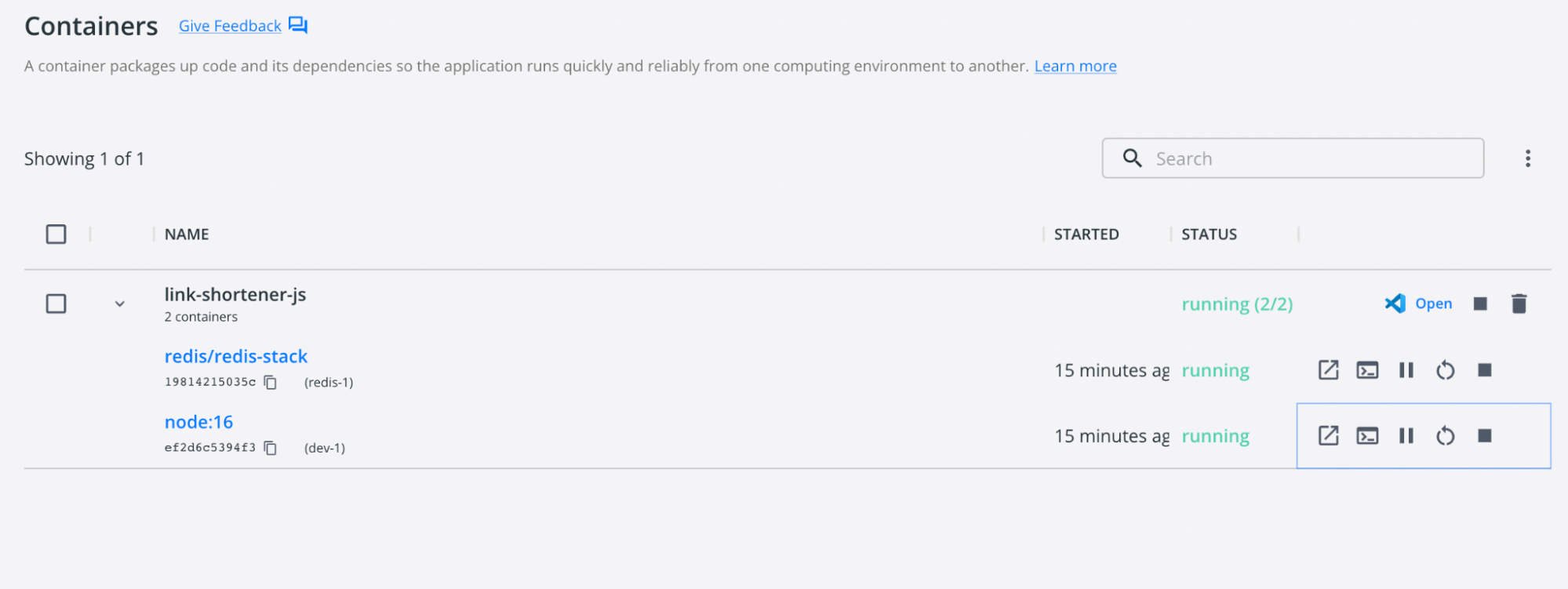 docker compose ps NAME COMMAND SERVICE STATUS PORTS link-shortener-js-dev-1 "docker-entrypoint.s…" dev running 0.0.0.0:3000-&amp;amp;amp;amp;amp;amp;amp;amp;amp;gt;3000/tcp link-shortener-js-redis-1 "/entrypoint.sh" redis running 0.0.0.0:6379-&amp;amp;amp;amp;amp;amp;amp;amp;amp;gt;6379/tcp, 0.0.0.0:8001-&amp;amp;amp;amp;amp;amp;amp;amp;amp;gt;8001/tcp