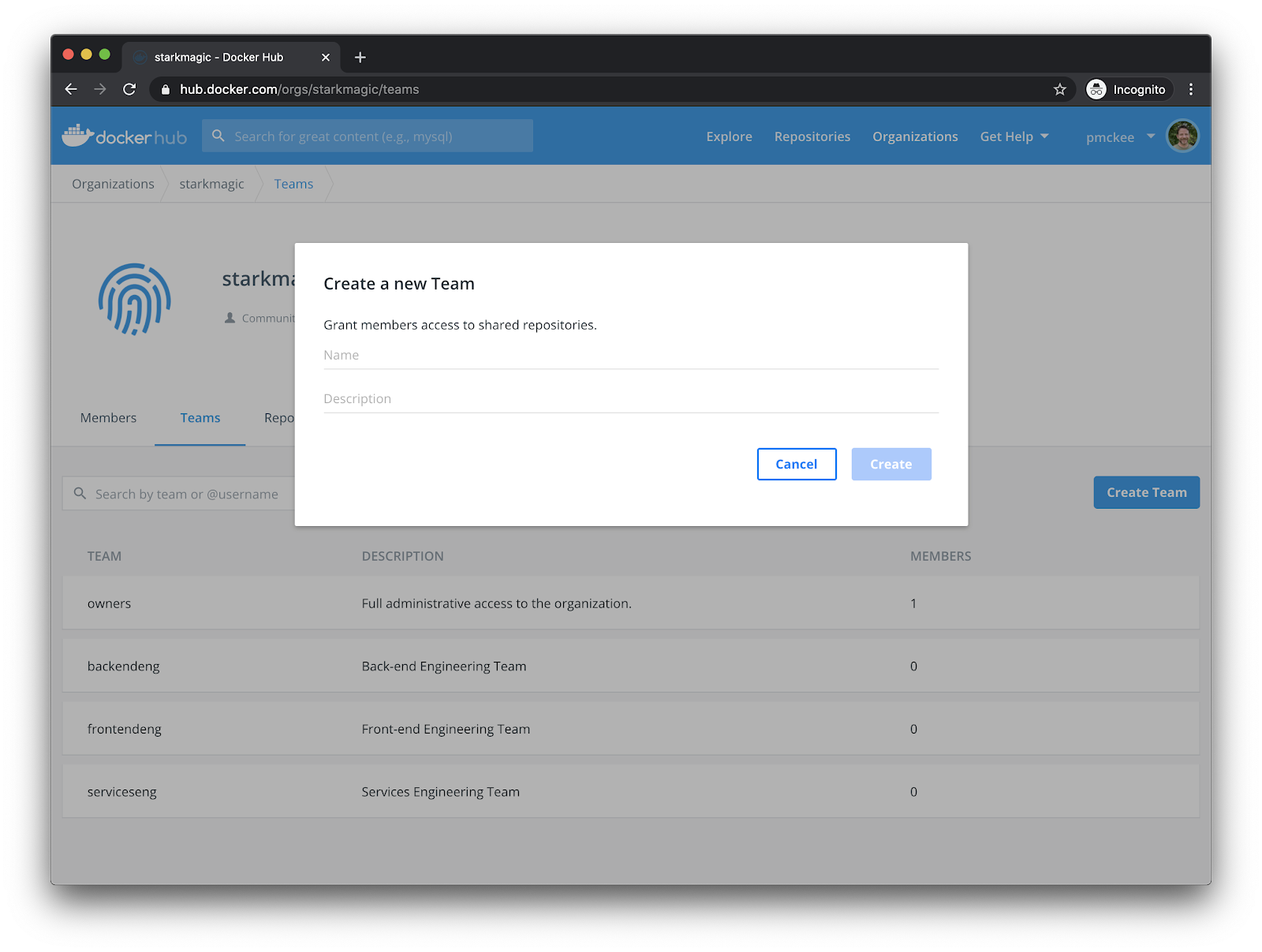 In Docker Hub, Teams are a collection of Docker IDs. We will use this construct to group users and assign privileges to image repositories that are owned by the Organization.