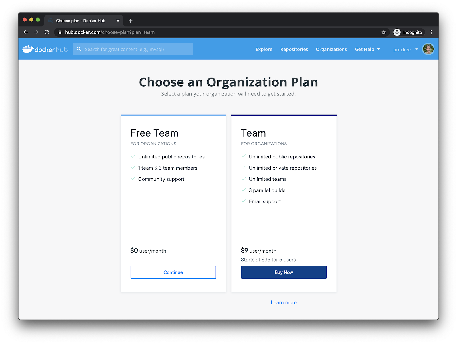 Once you’ve selected the Team plan, you’ll walk through the steps of setting up the Organization.