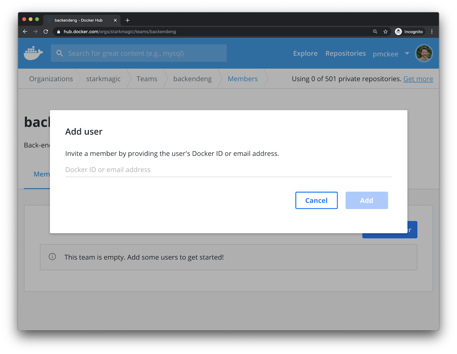 Adding a user to a team is pretty straightforward. Select one of the teams from the list. Then click the blue “Add Member” button. Now, go ahead and enter the Docker ID of the user you want to add.