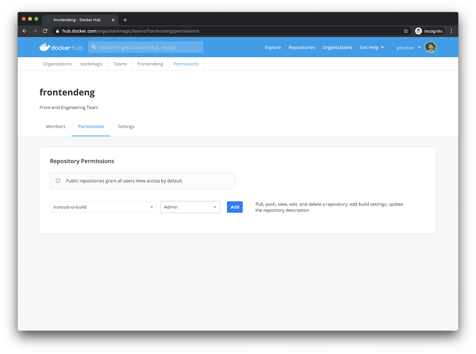 From the drop down menu, choose the “ironsuit-ui-build” repository and then choose “Admin” from the permissions dropdown.