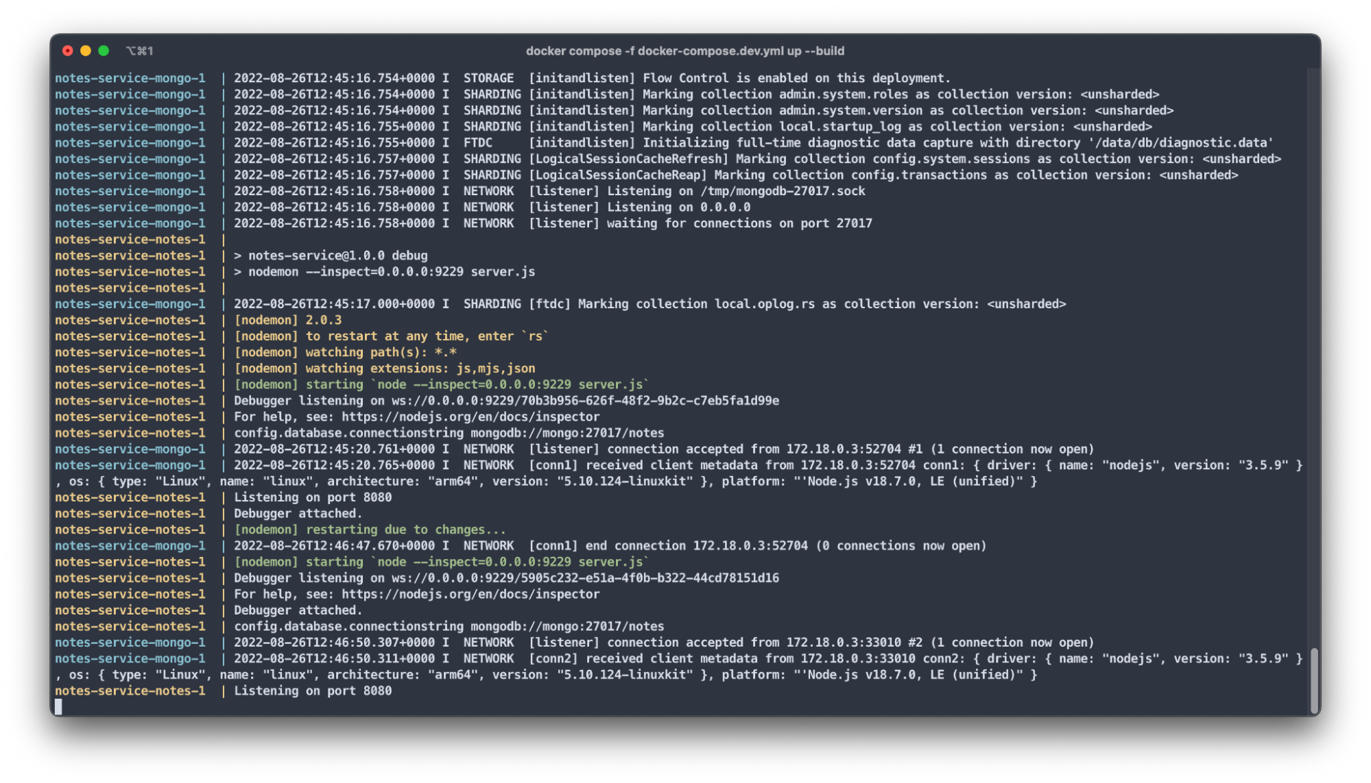 Instead, we’ll create a Compose file to start our notes-service and the MongoDb with one command. We’ll also set up the Compose file to start the notes-service in debug mode. This way, we can connect a debugger to the running node process.