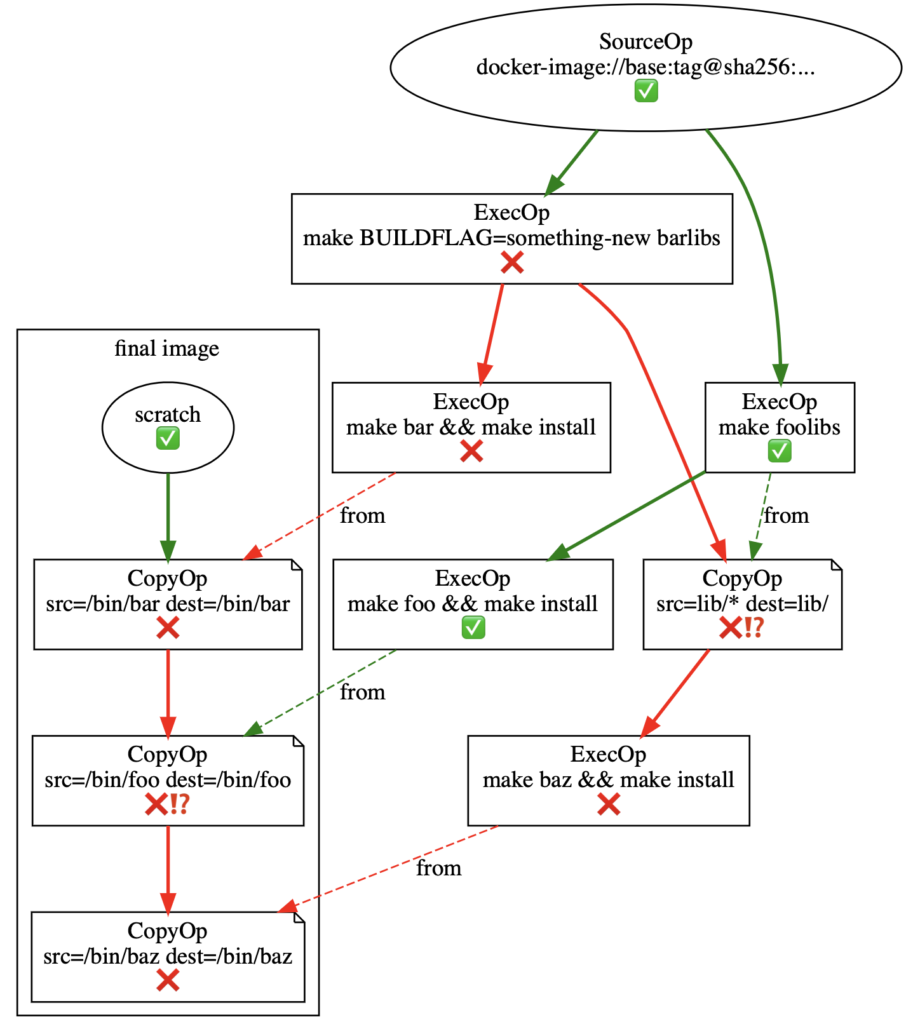 Again, BuildKit checks to see if any LLB vertex dependencies have changed before grabbing the cached result. Changes invalidate the cache and force a rerun, which cascades to any descendent vertices: