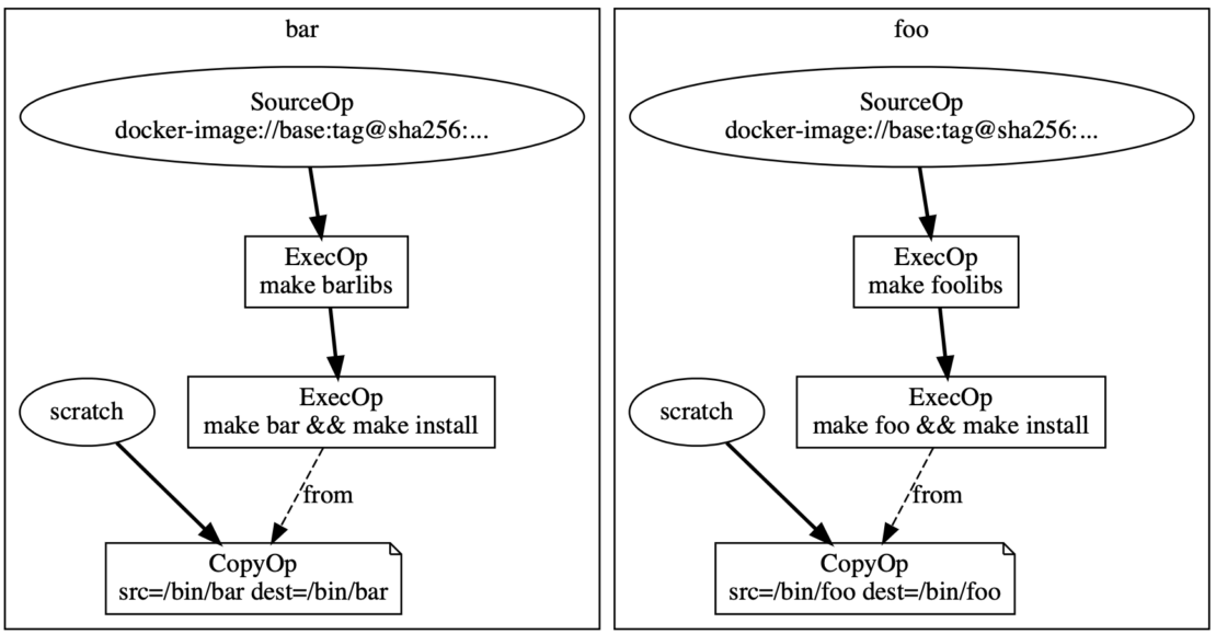 Superficially, it’s odd that BuildKit had any trouble modeling software-dependency DAGs since it uses DAGs to represent builds. Let’s explore an example to see what those issues were.