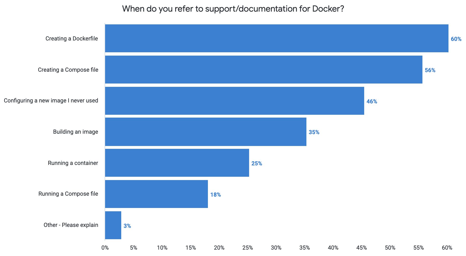 たとえば、Dockerの2022年のアプリケーション開発状況調査では、Dockerユーザーがサポート/ドキュメントを最も頻繁に参照するタスクは Dockerfileの作成 であることがわかりました( 回答者の60%が報告)。 他の改善点の中でも、この発見は Docker AIの革新に拍車をかけるのに役立ちました。