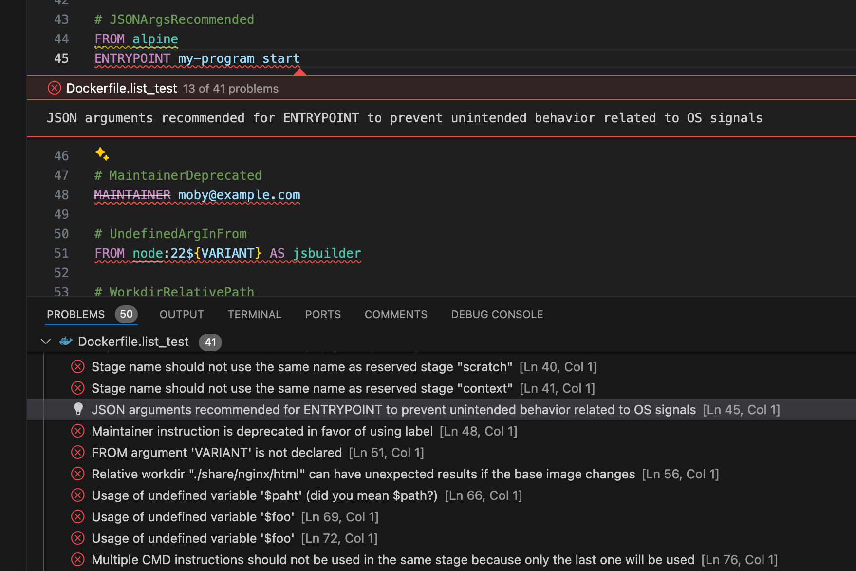 ãã«ããšã©ãŒãšåæ§ã«ãDocker Desktop ã§ãã«ããæ€æ»ãããšãèŠåã Dockerfile ã«ã€ã³ã©ã€ã³ã§è¡šç€ºãããŸãã