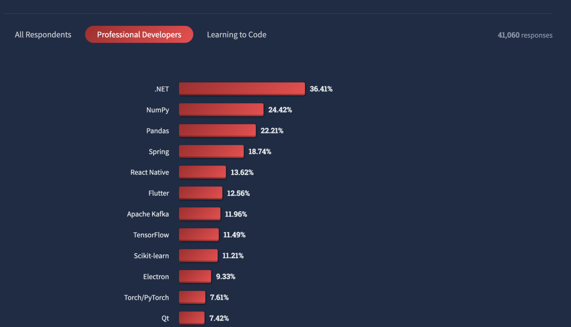 過去 5 年間、 .NET はプロの開発者の間でトップ フレームワークとしての地位を維持してきました。 Stack Overflow の 2022 年開発者調査 では 、.NET は "その他のフレームワークとライブラリ" カテゴリで 1 位にランクされました 。Stack Overflo w は、昨年、 主要なテクノロジーを使用し て 広範な開発作業を行 い 、来年もそれらを引き続き使用したい 開発者のためにこれを予約しています。