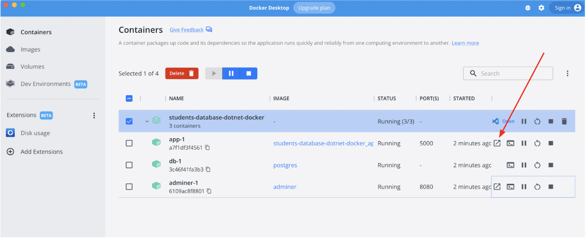 起動して実行したら、Dockerダッシュボードを表示し、「矢印」キー(app-1に表示)をクリックして、アプリケーションにすばやくアクセスできます。