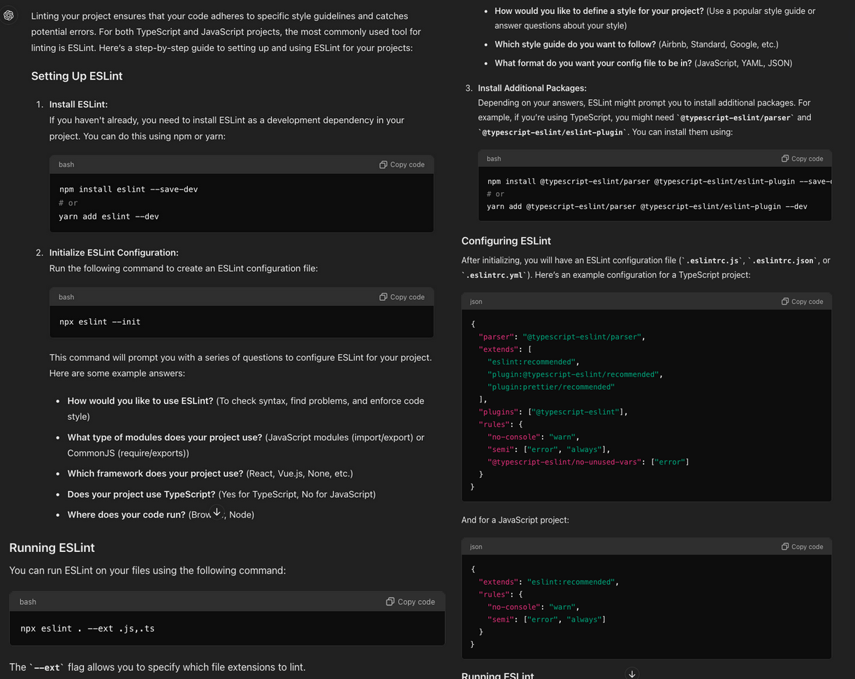 ただし、この応答では、多くのプロジェクトで機能しない構成、またはユーザーが手動で行うための定型的なセットアップタスクが提供されます。 これは、Pylint や golangci-lint などの他のリンターとは対照的であり、LLM がリンティングへの明確な道を見つけるには、リンギストが実際に十分でした。 したがって、ESLintでは、LLMがこれを理解するのを助けるために、より多くの知識を追加する必要があります。