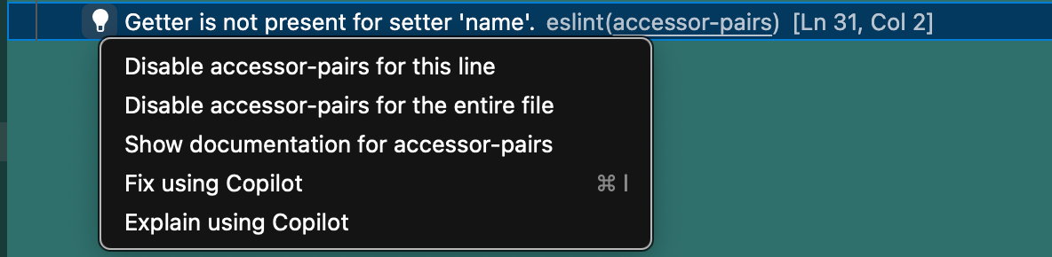 たとえば、Copilot に以前の行を修正するように依頼すると、ESLint からの追加のコンテキストが欠けます (図 5)。