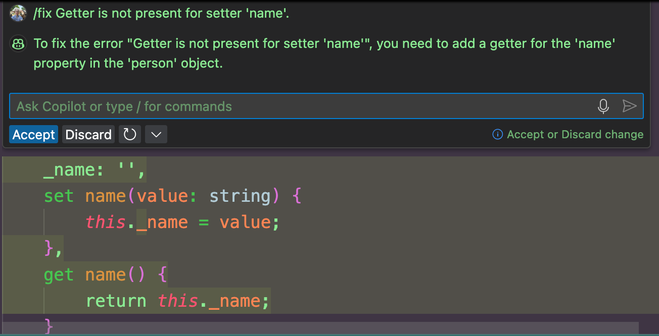 アシスタントは、そこに違反があると推論できません。 この例では、Copilot は開発者のエディター アクションによってトリガーされ、リンターからのコンテキストがまったくないため、幻覚を見ています。 Copilotが知る限り、私はそれに完全に良いコードを修正するように頼んだだけです。