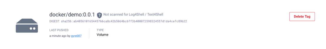 Docker Hub のリポジトリ ページにアクセスする demo と、すべてのアーティファクトが [ タグとスキャン] の下に一覧表示されます。