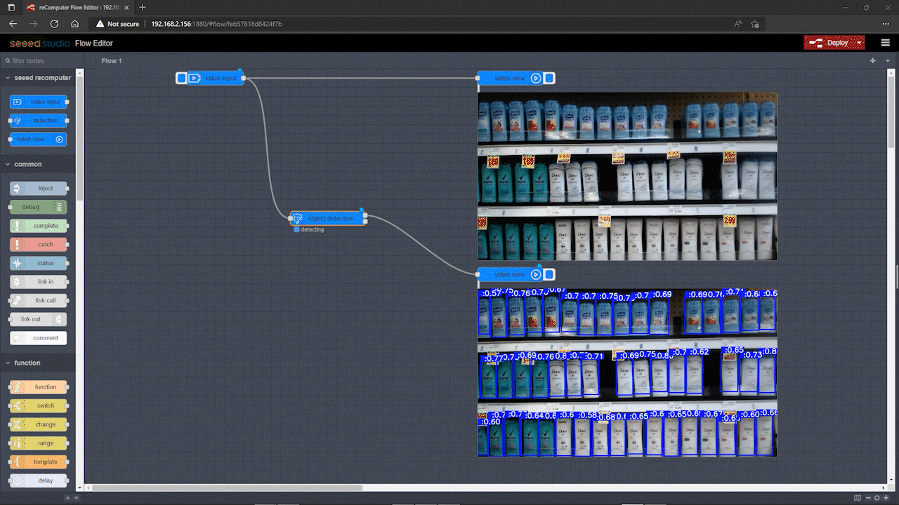 右上隅でトリガー Deploy して、デプロイ プロセスを開始します。 これで、Node-REDがアイテムを検出するときにプロセスが機能していることを確認 detection できるはずです。