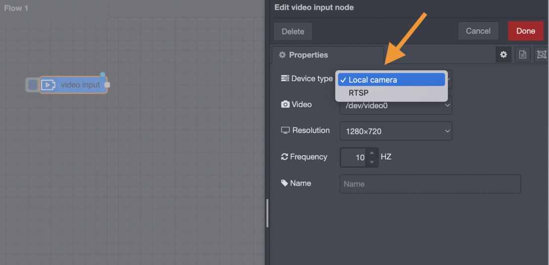 ノードをパレットからワークスペースに1つずつドラッグして、ノードを配線してみましょう。 まず、パレットからワークスペースにドラッグ video input してみましょう。 「ビデオ入力」をダブルクリックして次のプロパティを表示し、「ローカルカメラ」を選択します。