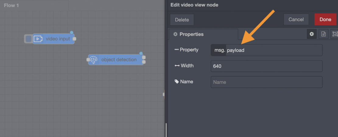 次に、パレットからワークスペースにドラッグします Video View 。 を Video View ダブルクリックすると、[ プロパティ ]セクションですでに選択されていることがわかります msg.payload 。