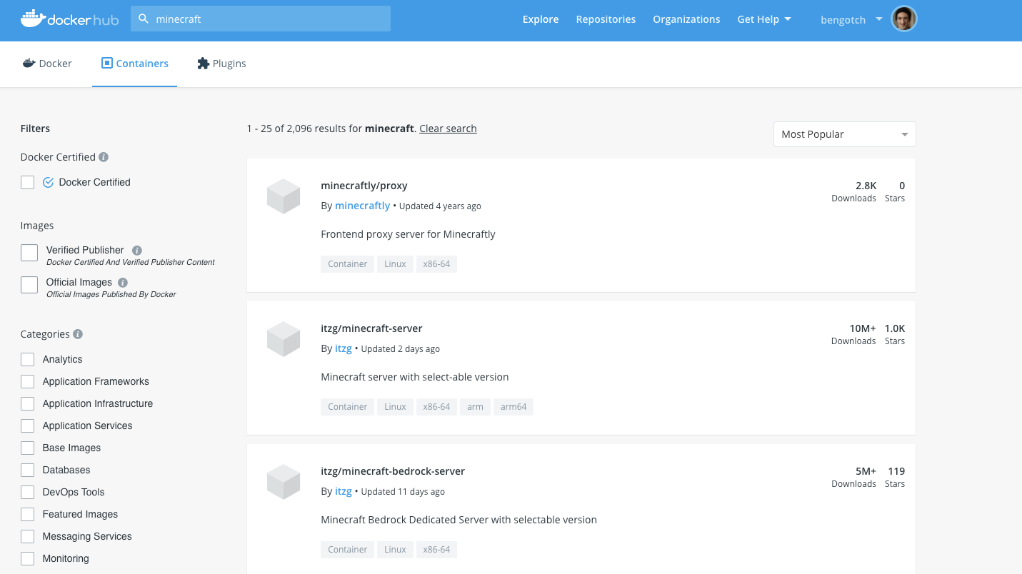 私が最初にやろうと決めたことは、Minecraftサーバー用の既存の Dockerイメージ をチェックして、使い勝手の良いものがあるかどうかを確認することでした。