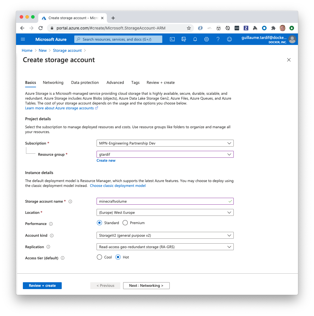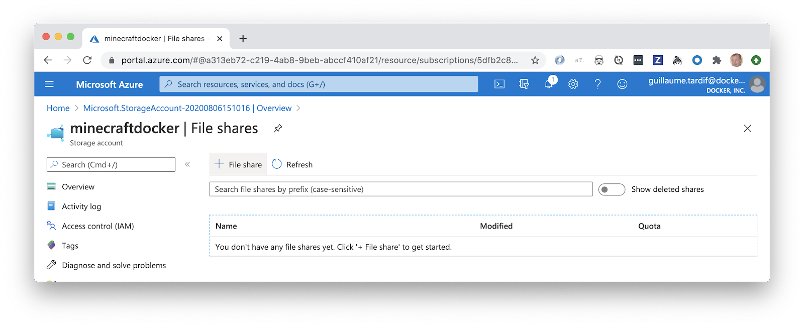"minecraftdocker" ストレージ アカウントが作成されたら、すべての Minecraft ファイルを保持するファイル共有を作成します。