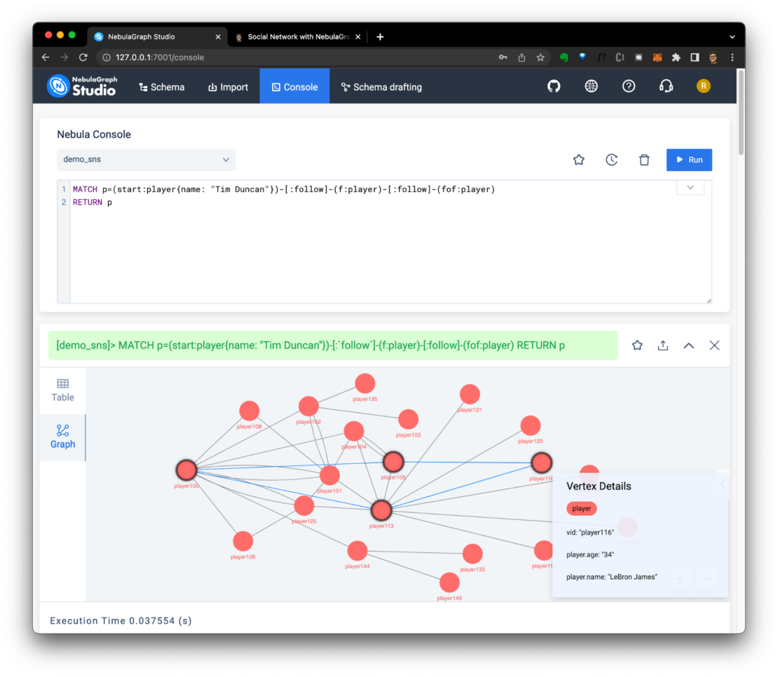 クエリ結果を表示するだけでなく、パターン全体を返して、簡単に分析情報を得ることができます。 たとえば、図 9 では、レブロン ジェームズが Tim と 2 つの共通の友人の道を歩んでいることがわかります。