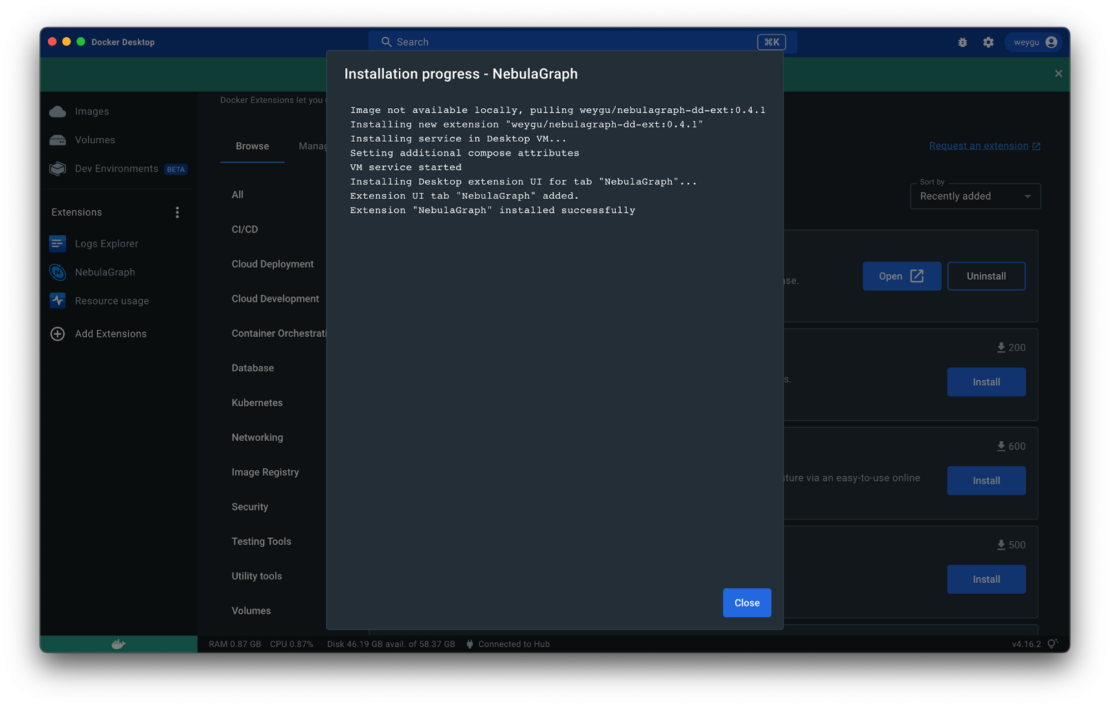 NebulaGraph 拡張機能は、Docker Desktop の Extensions Marketplace および Docker Hub から入手できます。 開始するには、拡張機能マーケットプレイスでNebulaGraphを検索し、[ インストール ]を選択します(図3)。
