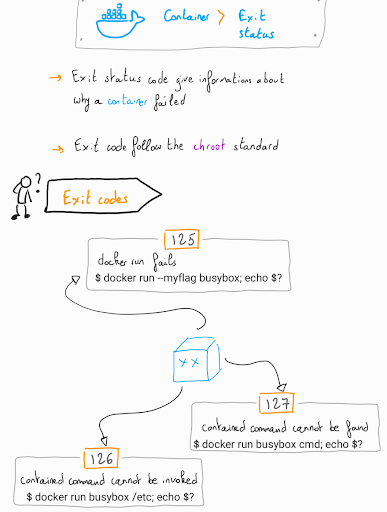 それが「トップチップ」であるかどうかはわかりませんが、コンテナには終了ステータスコードがあり、コンテナが失敗した理由についての説明を提供できることを知っておくと便利だと思います。