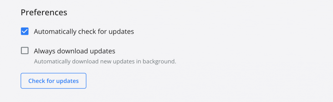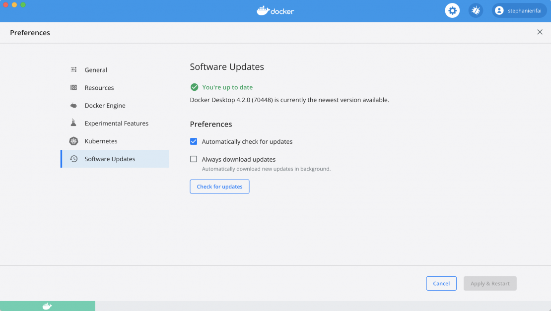 Dockerサブスクリプションの更新に対する皆様の積極的なサポートのおかげで、すべてのユーザーにより多くの価値を提供することに集中することができました。 Docker Desktop 4.2 では、サブスクリプション レベルに関係なく、すべてのユーザーが更新プログラムの自動チェックをオフにできるようになりました。 この設定を無効にすると、クジラメニューとアプリのすべての通知が無効になり、更新を手動で確認する必要があります。 Dockerデスクトップ4.2 にアップデートするだけで、この機能の使用を開始できます。