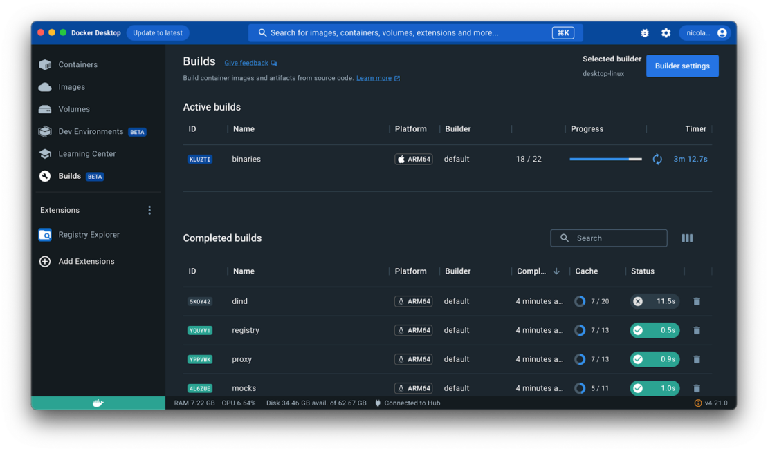 Docker Desktop 4.21 には、 ビルド ビューのベータ リリースが含まれています。 ビルドビューでは、システムで現在実行中のアクティブなビルドを可視化し、完了したビルドの分析とデバッグを行うことができます。