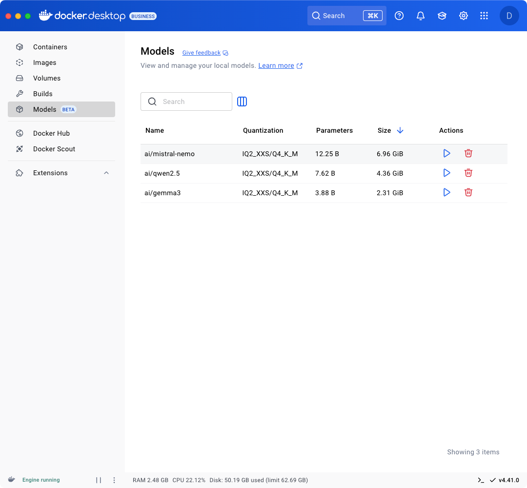 モデルを管理するためのCLIサポートに加えて、Docker DesktopにはGUIに専用の 「モデル」 セクションが含まれるようになりました。これにより、開発者は、コンテナ、ボリューム、イメージと並行して、モデルを視覚的に参照、実行、管理する柔軟性が増します。