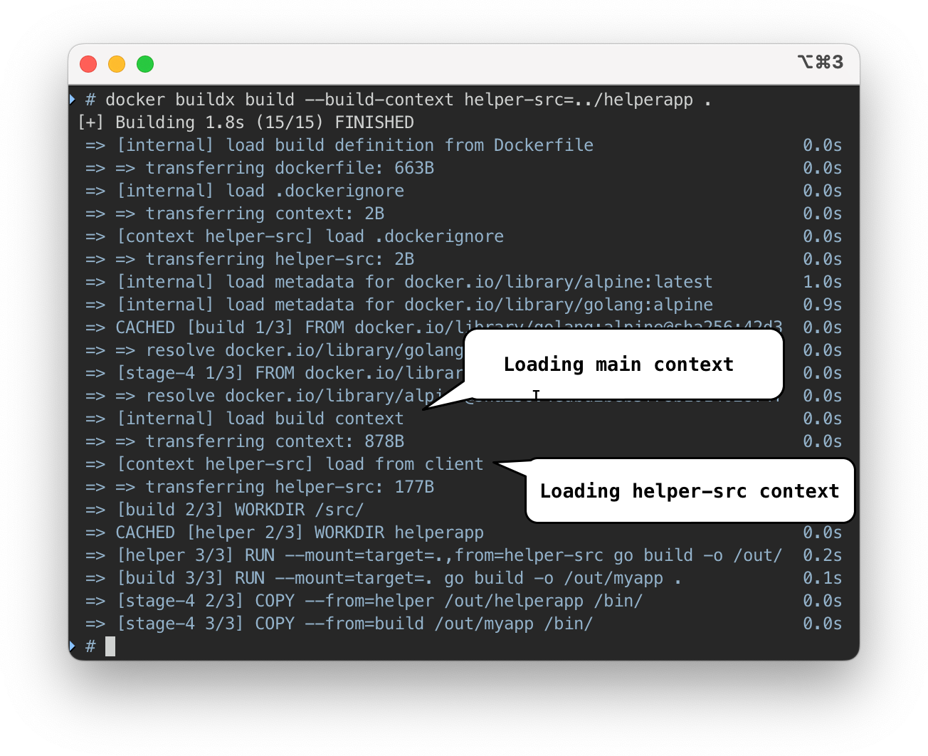 FROM alpine AS helper-clone RUN apk add git WORKDIR /src ARG HELPERAPP_VERSION=1.0 RUN git clone https://github.com/someorg/helperapp.git && cd helperapp && git checkout $HELPERAPP_VERSION FROM scratch AS helper-src COPY âfrom=helper-clone /src/helperapp / FROM golang:alpine AS helper WORKDIR helperapp RUN âmount=target=.,from=helper-src go build -o /out/helperapp . FROM alpine COPY âlink âfrom=helper /out/helperapp /bin COPY âlink âfrom=build /out/myapp /bin