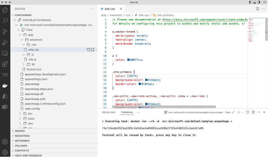 実行中のコンテナーの下にある [ ファイル ] グループを展開し、一覧から任意のファイルを選択します。 以下の例では、 site.css ディレクトリからファイルをプレビューします app/wwwroot/css 。