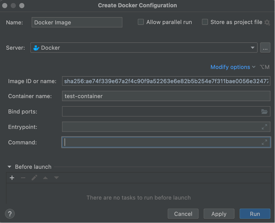 これにより、[Docker 構成の作成] ウィンドウが起動し、ポート バインド、エントリポイント、コマンド変数などを構成できます。
