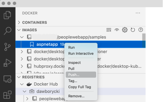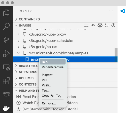 以前に引っ張った ASP.NET 画像を覚えていますか? これで、[イメージ] グループを展開し、ASP.NET コア イメージを使用してコンテナーをスピンアップできます。 mcr.microsoft.com/dotnet/samples リストを見つけてタグを右クリックし aspnetapp 、[実行]を選択します。