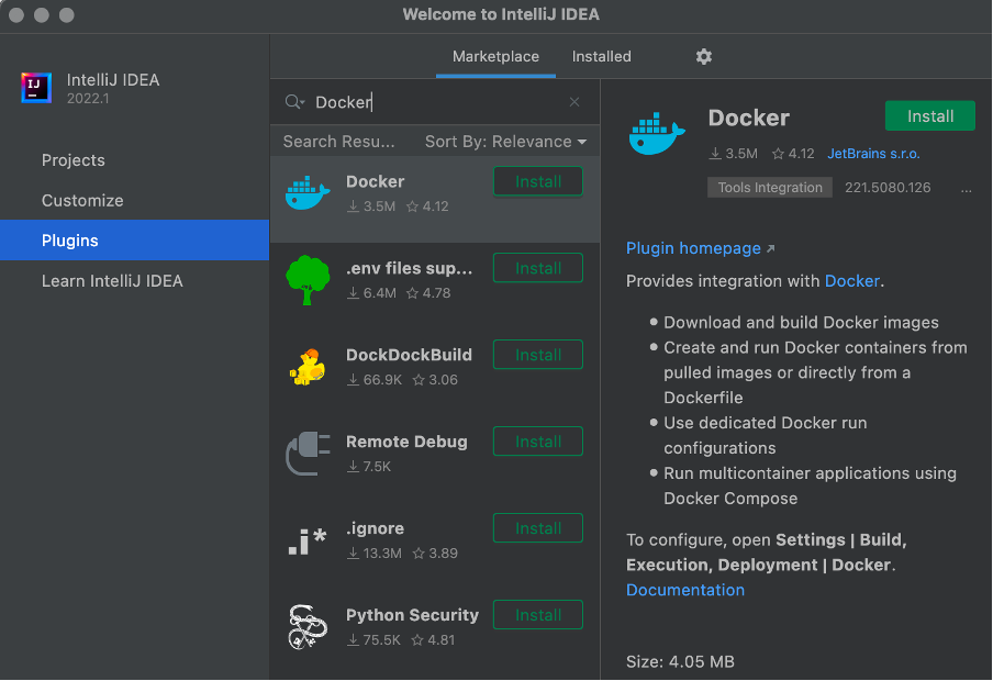 IntelliJ IDEA Ultimate Edition では、Docker プラグインはデフォルトで有効になっています。 ただし、Community Editionを使用している場合は、プラグインを手動でインストールする必要があります。