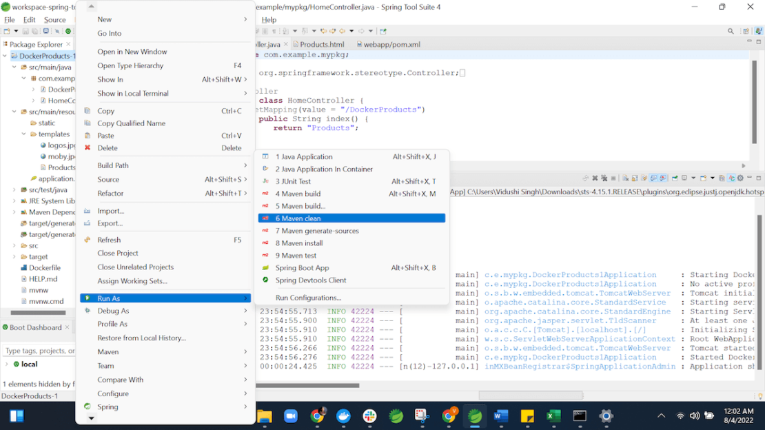 ãããžã§ã¯ããå®è¡ããŠãã¹ãããŸããã æ¬¡ã«ãJAR ãã¡ã€ã«ãäœæããŠã¢ããªã±ãŒã·ã§ã³ãæ§ç¯ããŸãã Spring Tool Suiteå ã®ãMavenã¯ãªãŒã³ãã€ã³ã¹ããŒã«ãªãã·ã§ã³ãéžæããŸãã