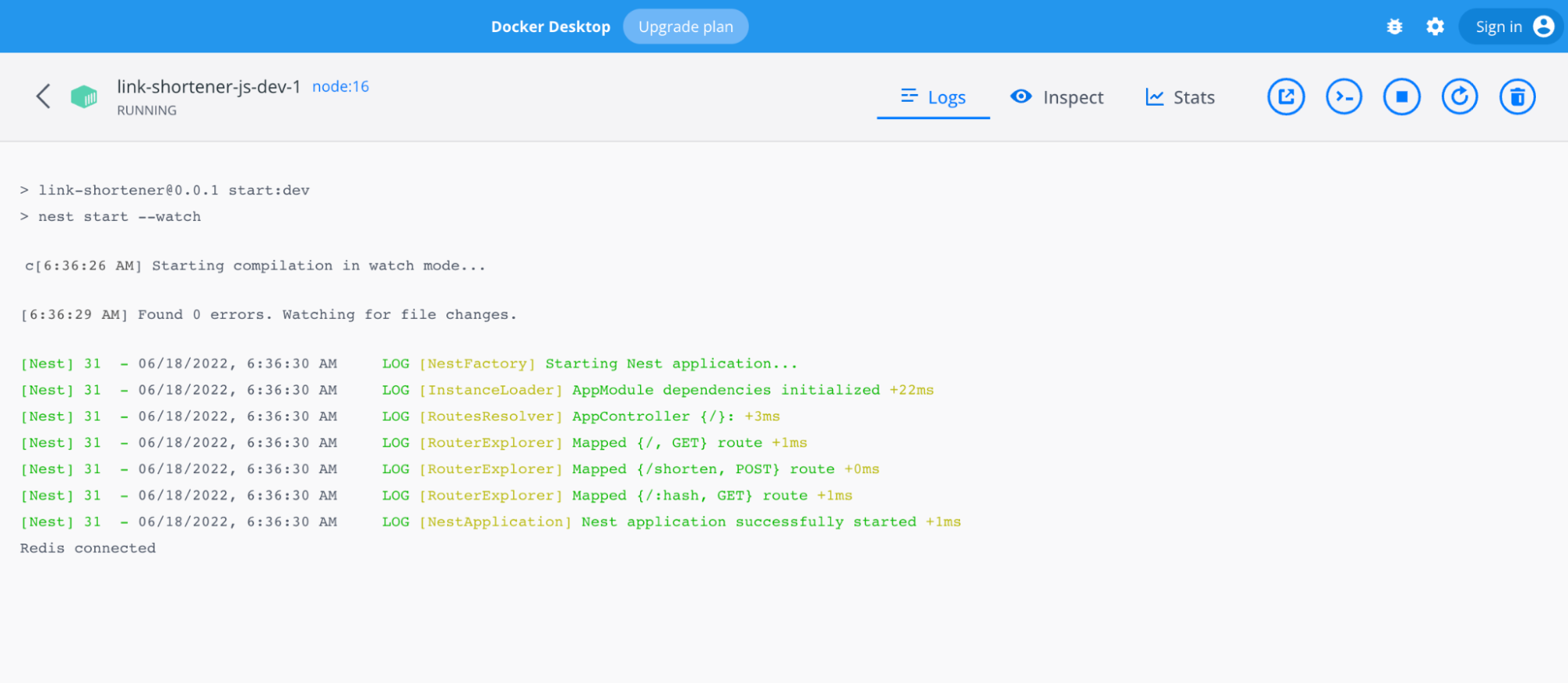link-shortener-js-dev-1 | [Nest] 31 - 06/18/2022, 6:17:23 AM LOG [NestApplication] Nest application successfully started +1ms