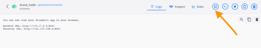 まず、一覧からアプリ コンテナーを選択します。 これにより、[ログ] ビューが開きます。 [統計] ペインの横にある四角いアイコン (斜めの矢印) が付いたボタンをクリックします。 これにより、ブラウザーでアプリが開きます。