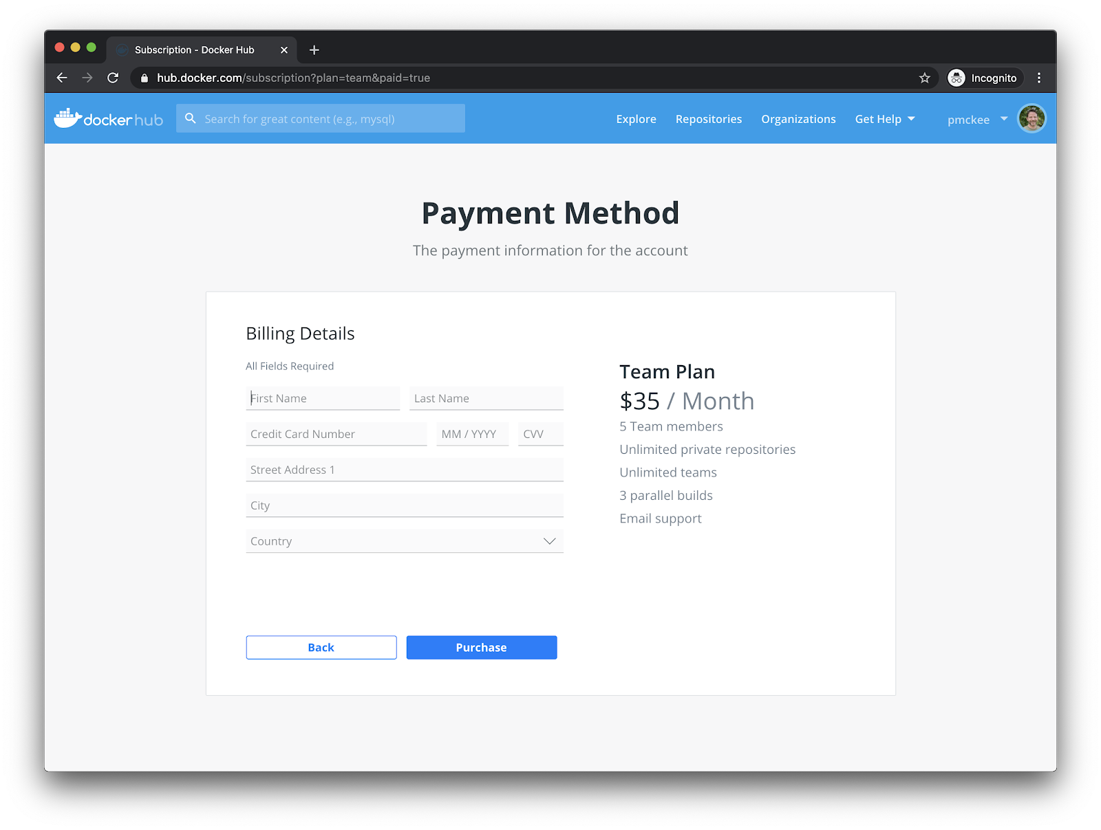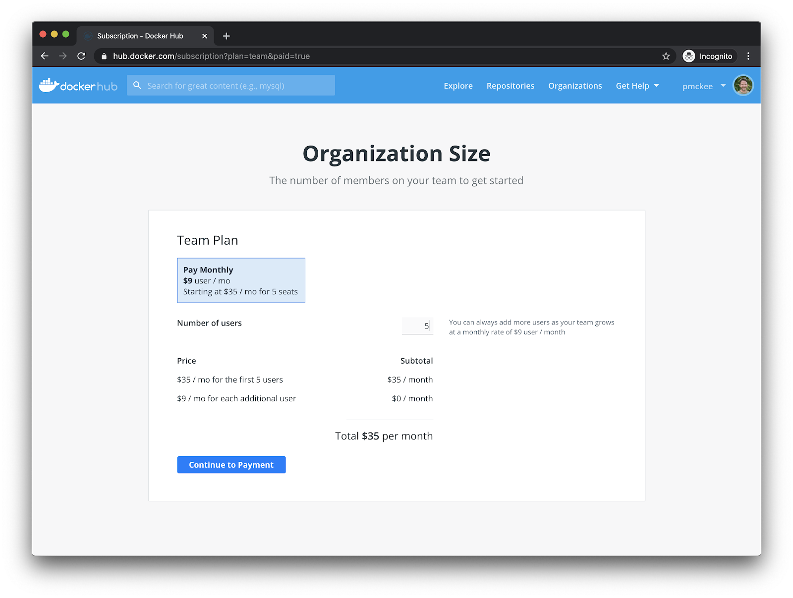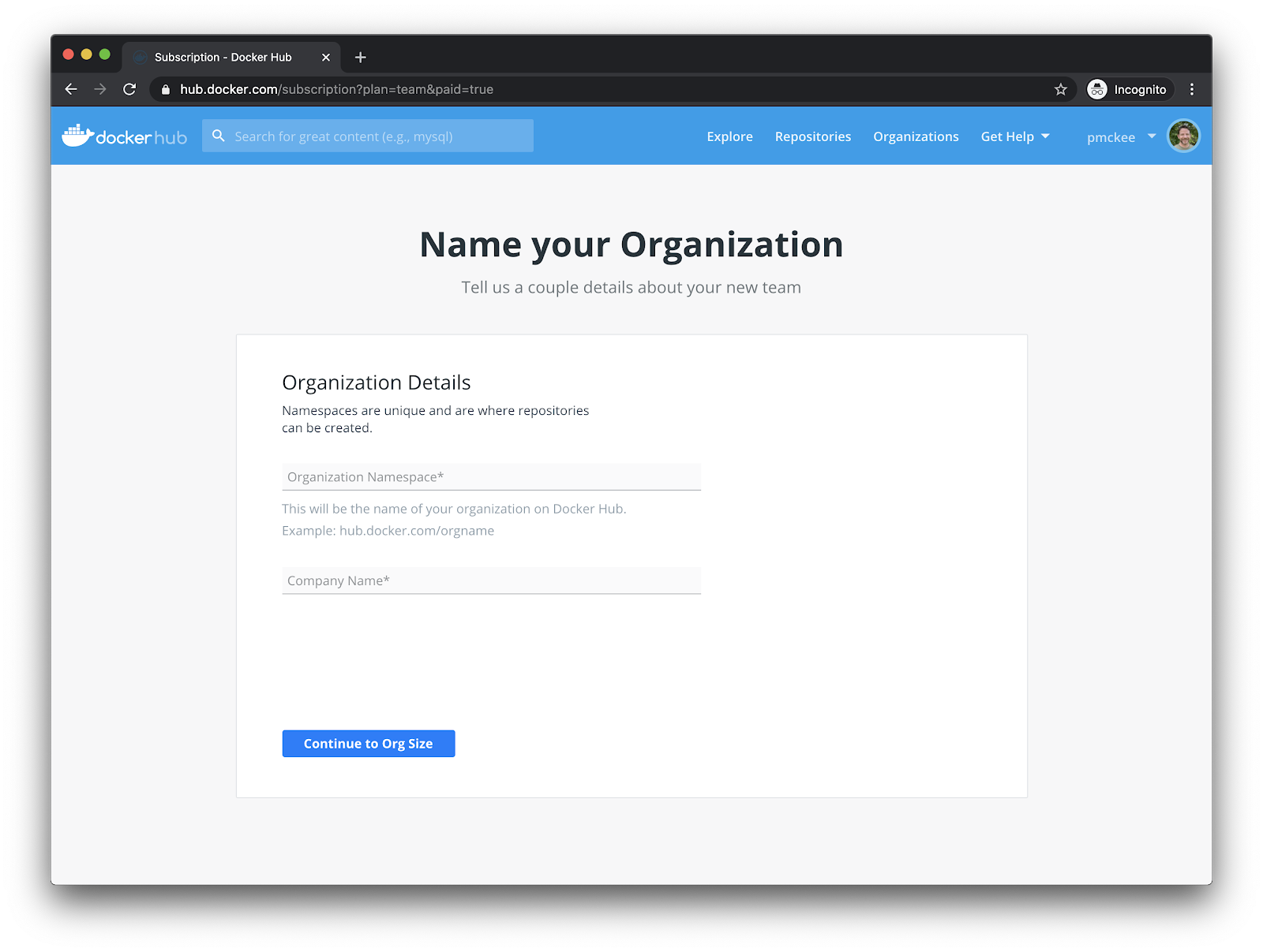 組織の所有者になりたいアカウントのログインハブ。 所有者として使用するDocker IDが100%わからなくても心配しないでください、必要に応じて後で所有者を追加できます。