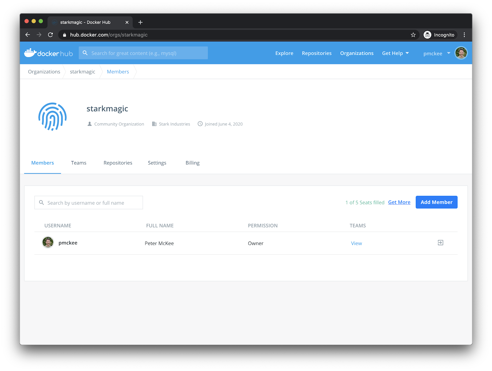 チームへのユーザーの追加は非常に簡単です。 リストからチームの 1 つを選択します。 次に、青い[メンバーの追加]ボタンをクリックします。 次に、追加するユーザーのDocker IDを入力します。