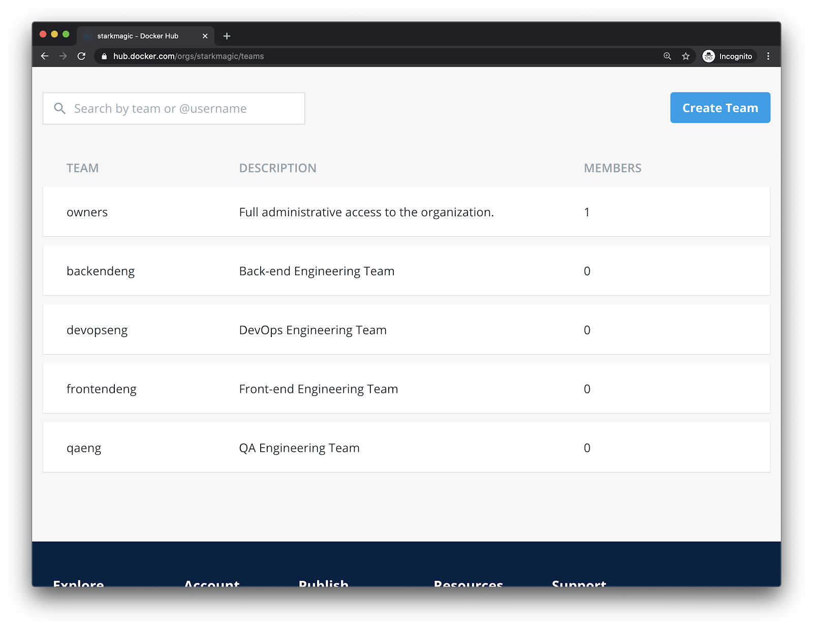 Docker Hub では、Teams は Docker ID のコレクションです。 このコンストラクトを使用してユーザーをグループ化し、組織が所有するイメージリポジトリに権限を割り当てます。