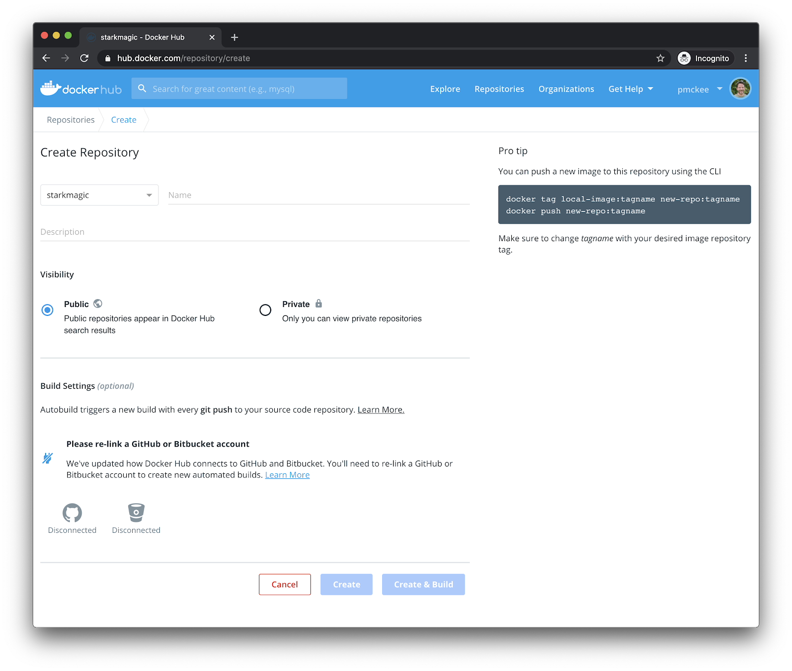 ドロップダウンから組織を選択し、新しい画像に名前を付けます。 オプションの説明を入力し、[プライベート] を選択します。 完了したら、「作成」ボタンをクリックします。