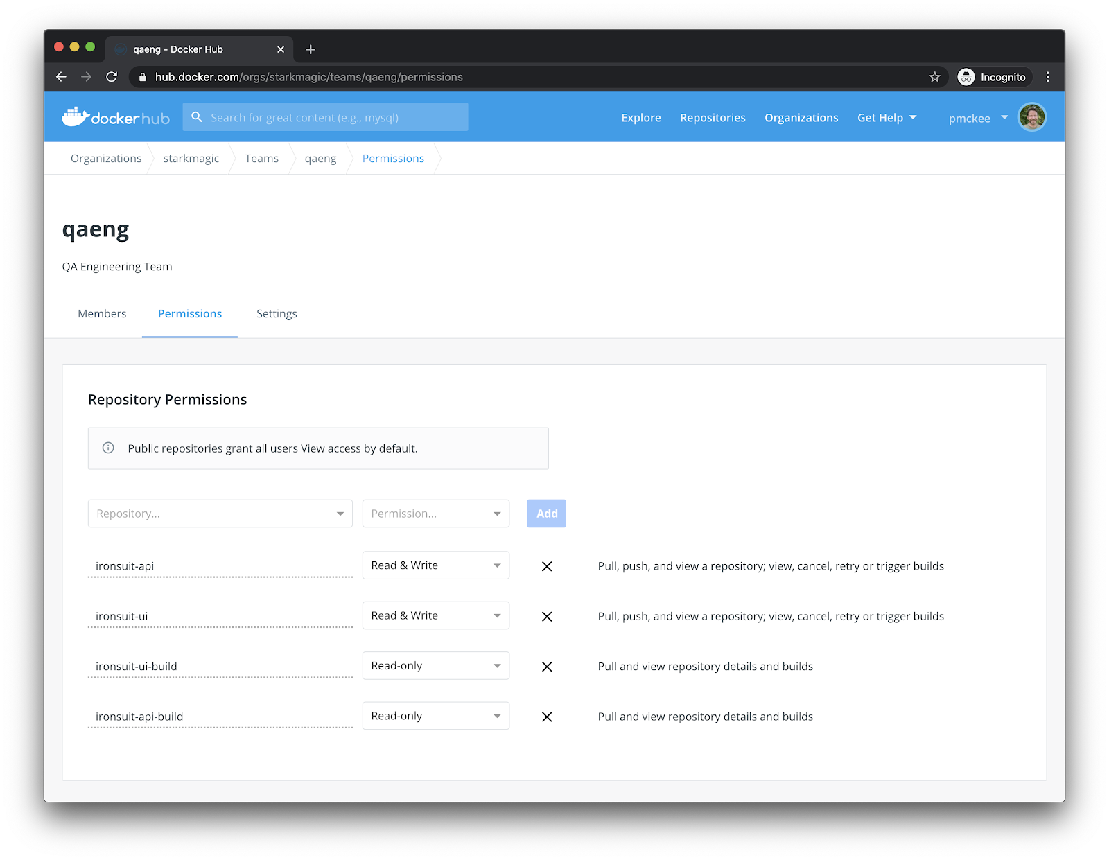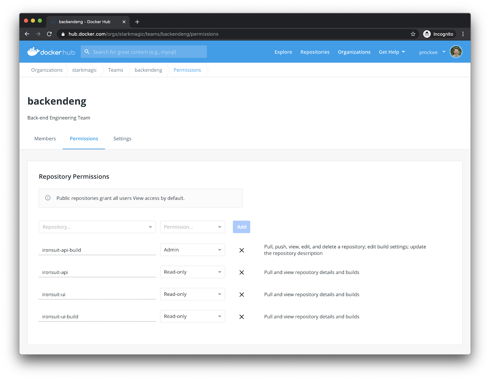 次に、バックエンドエンジニアリングチームについても同じことを行います。 "backendeng" チームの "管理者" アクセス許可を "ironsuit-api-build" に割り当て、"読み取り専用" を他の 3 つのイメージ リポジトリに割り当てます。