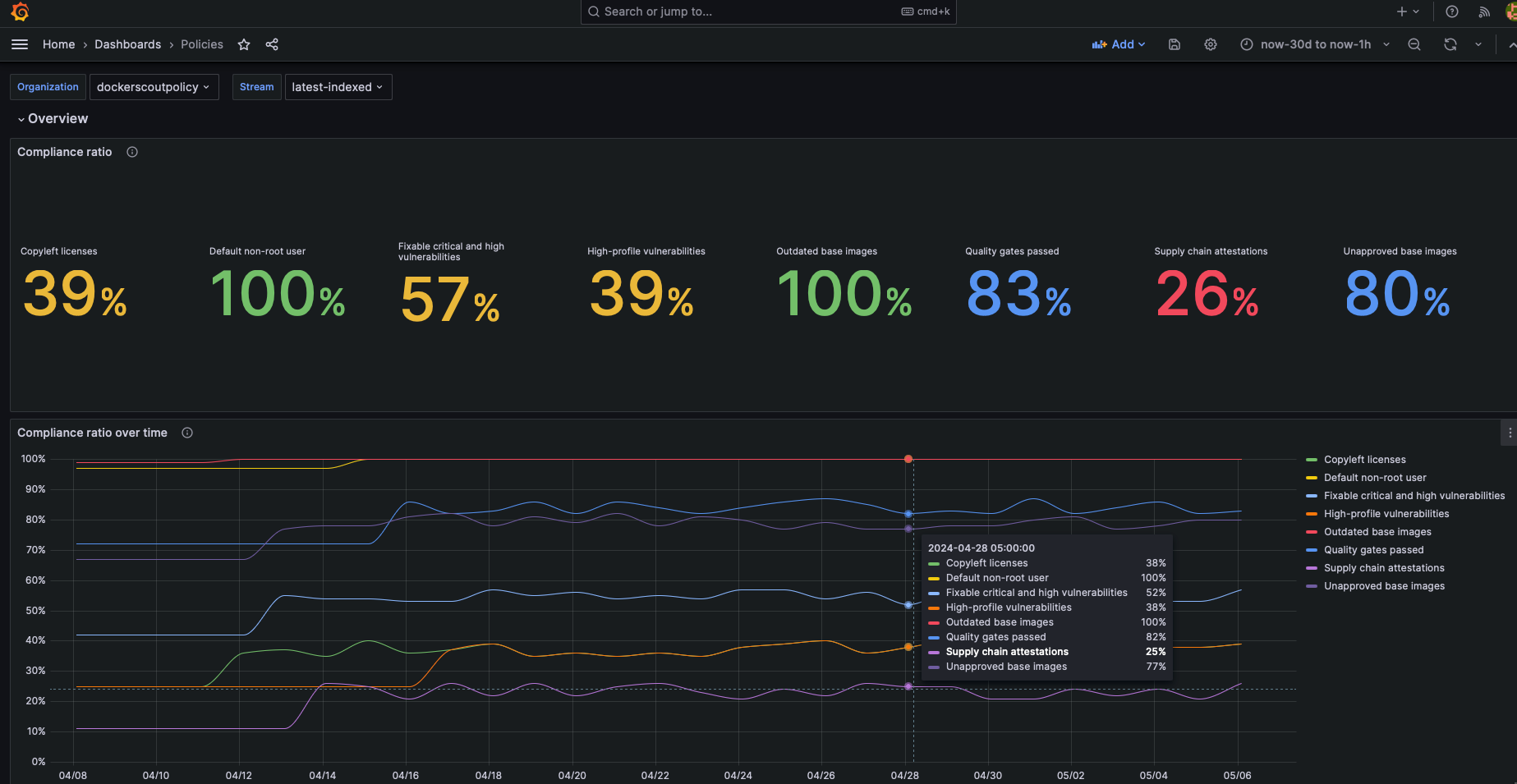 図 2 は、Docker Scout 組織内で構成された各ポリシーのコンプライアンス体制を示すダッシュボードを示しています。 この視覚化は、定義されたポリシーに準拠するストリーム内の画像の割合を示します。 ダッシュボードの上部には、各ポリシーの現在のコンプライアンス率が表示され、下部のセクションには過去 30 日間のコンプライアンスの傾向が表示されます。