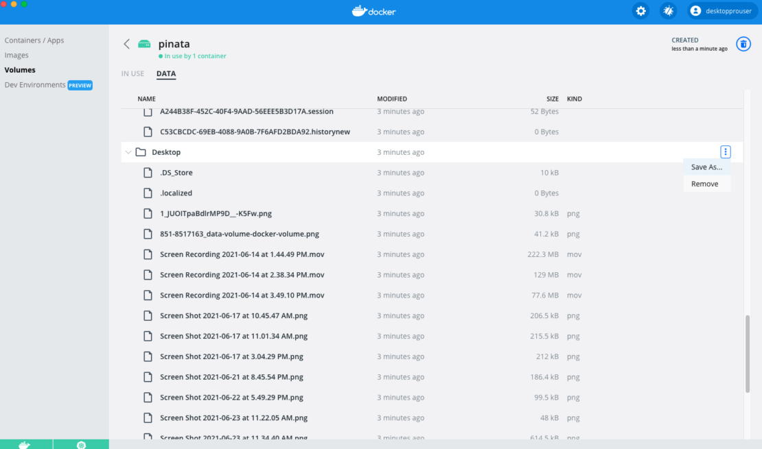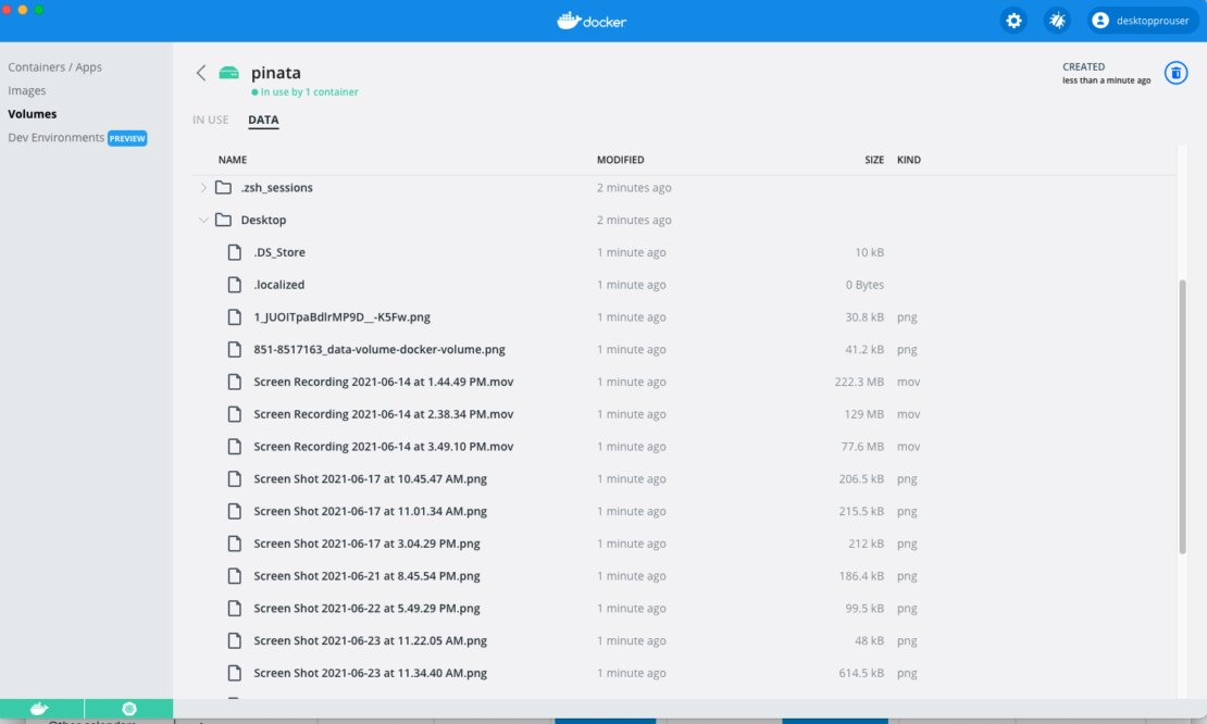 ボリュームはすぐにローカルディスクストレージを占有する可能性があり、使用されているボリュームやその内容を簡単に確認する方法がなければ、スペースを解放するのが難しい場合があります。 そのため、Docker Desktop 3.5 のリリースでは、Pro ユーザーと Team ユーザーがボリューム内のディレクトリとファイルをさらに簡単に探索できるようになりました。 ファイルの変更日、種類、サイズを追加したため、そのすべてのスペースを占有しているものをすばやく特定し、それを手放すことができるかどうかを判断できます。