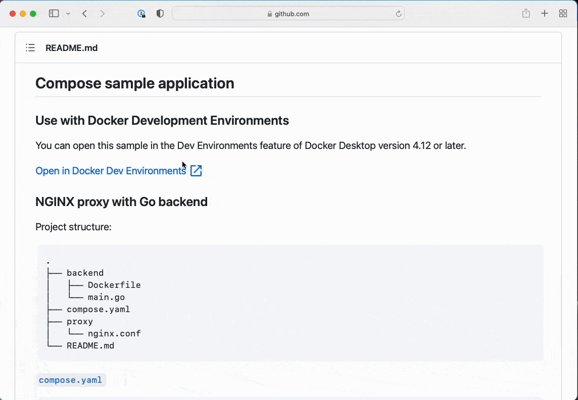 GitHub Awesome Compose サンプルを更新し、Docker Desktop で開発環境として簡単に起動できるプロジェクトを強調しました。 これにより、マルチサービス アプリケーションを開発環境プロジェクトとして追加する方法をすばやく理解できます。 Docker Compose アプリケーション サンプルの一覧で、次の緑色のアイコンを探します。