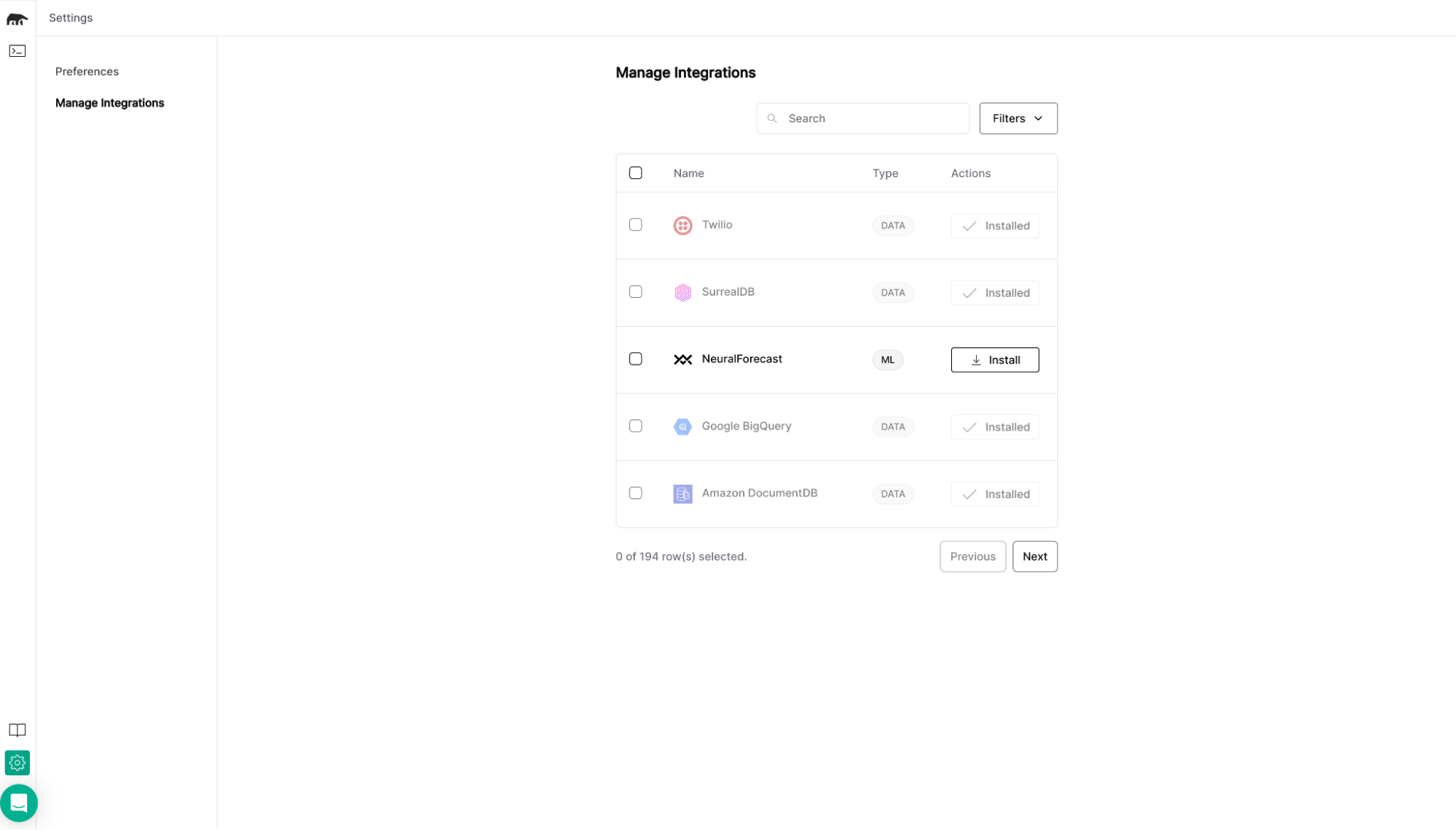 - MindsDB エディターで、[ 設定 ] と [統合の管理] に移動します。